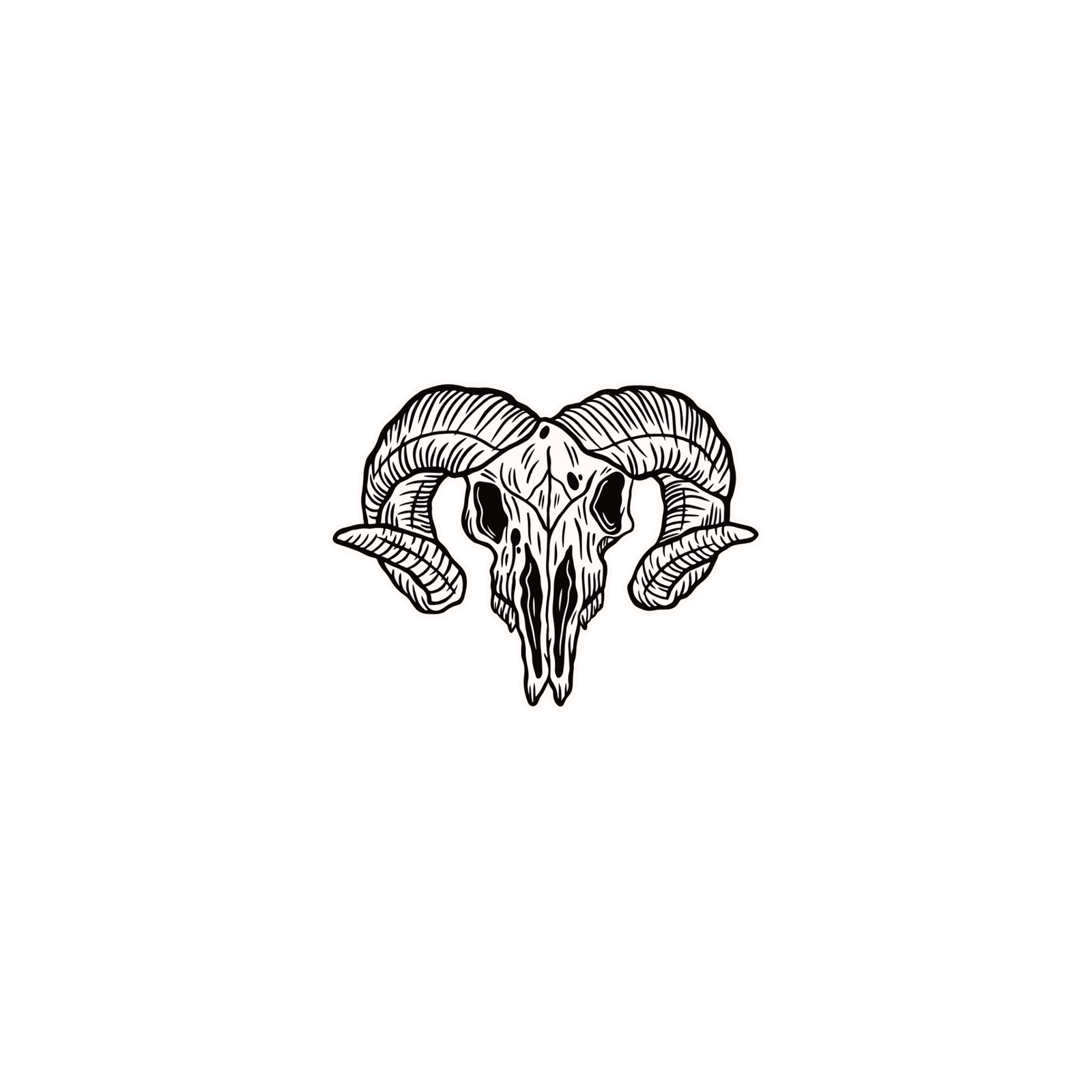 - Design: Detailed black and white illustration of a sheep skull with curled horns.