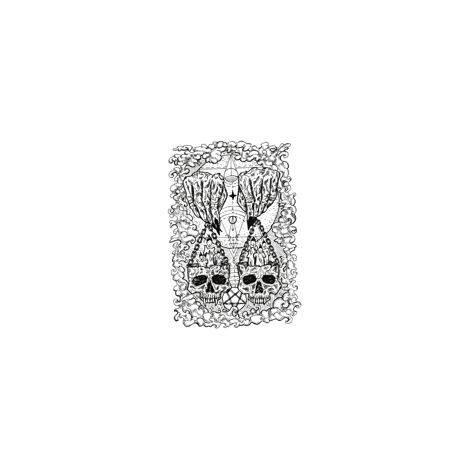 - Design: Detailed black and white illustration featuring two skulls with geometric and mandala motifs.