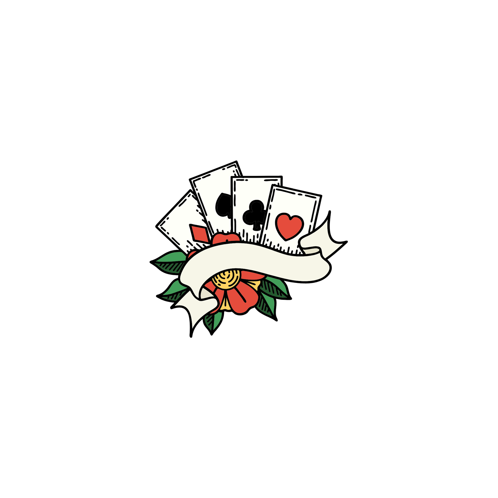 - Design Elements: Features a vibrant red flower surrounded by green leaves and five playing cards.