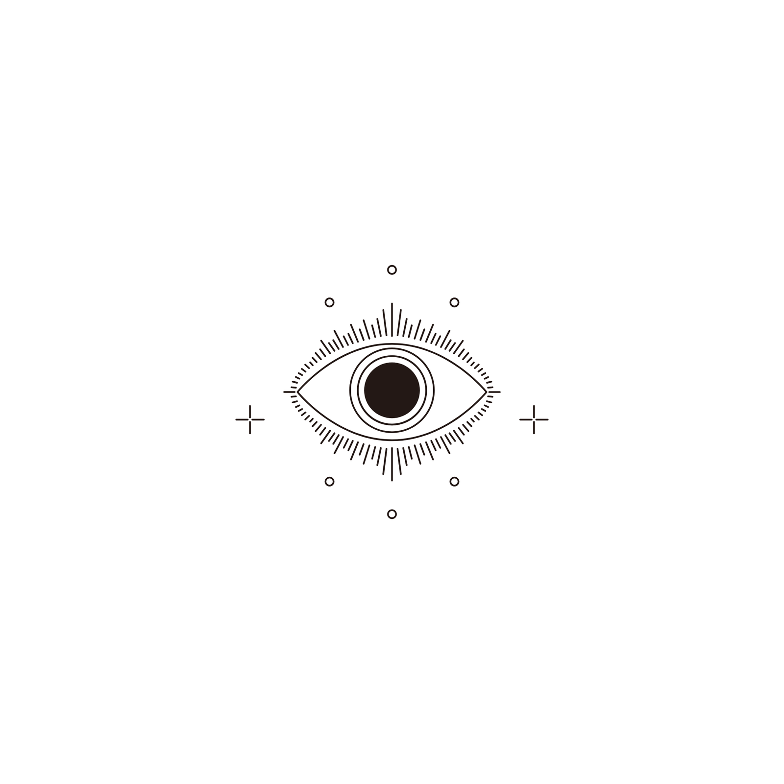 - Design: Stylized eye with a black iris, surrounded by fine white edges and a larger white circle for the pupil.