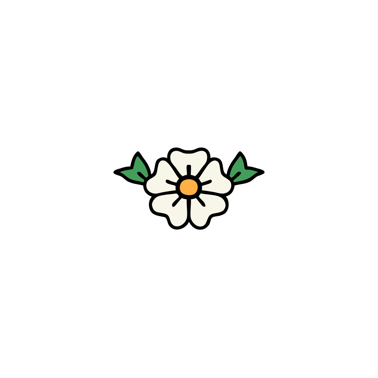- Design: Stylized flower with white petals, black outlines, and a yellow pistil.