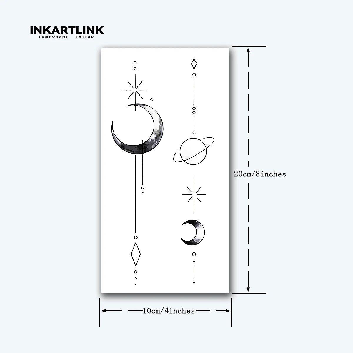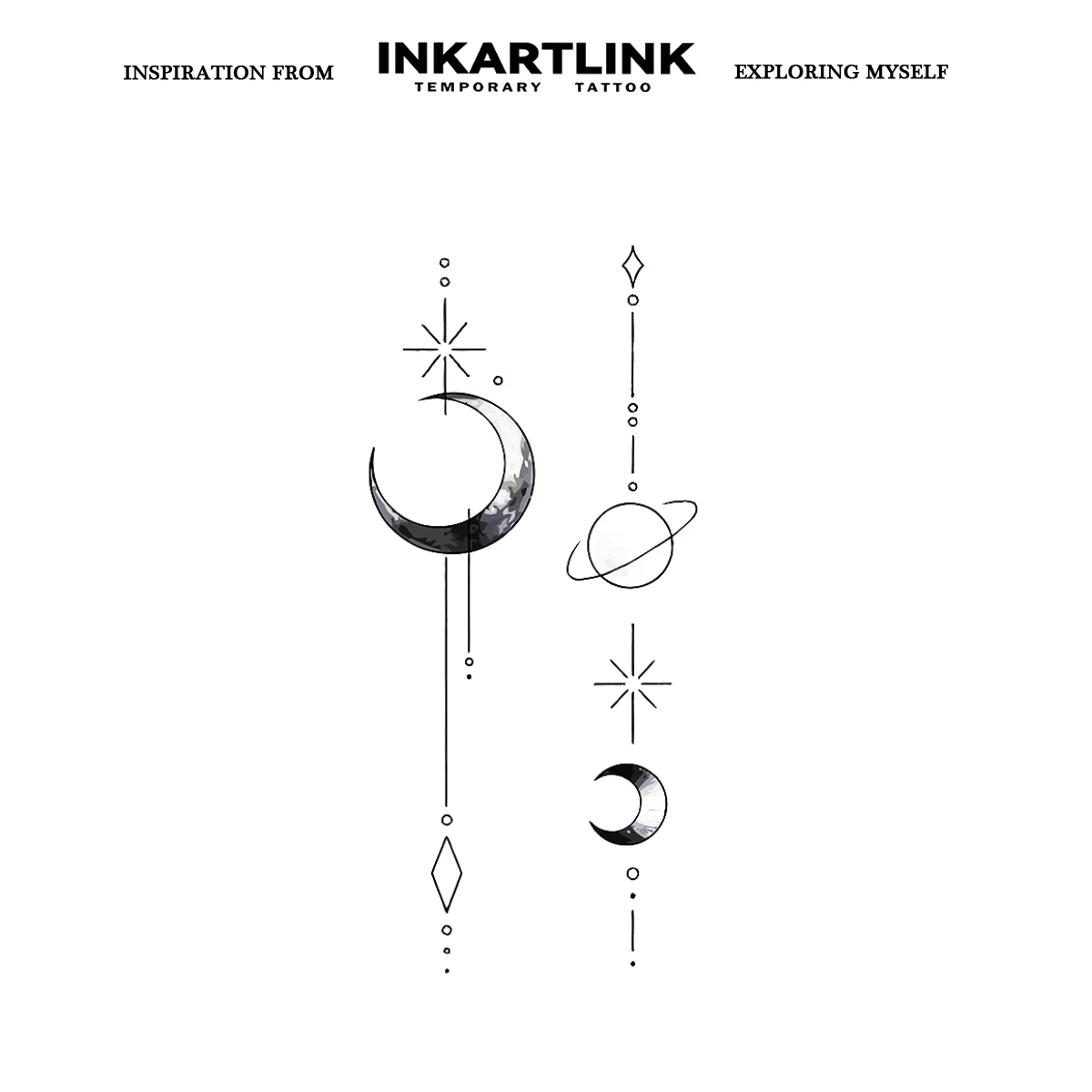 Ce tatouage temporaire présente un design cosmique avec des motifs de lune, d'étoiles et de planètes. Ce style minimaliste et élégant est parfait pour ceux qui veulent exprimer leur fascination pour l'univers et les mystères de l'espace.