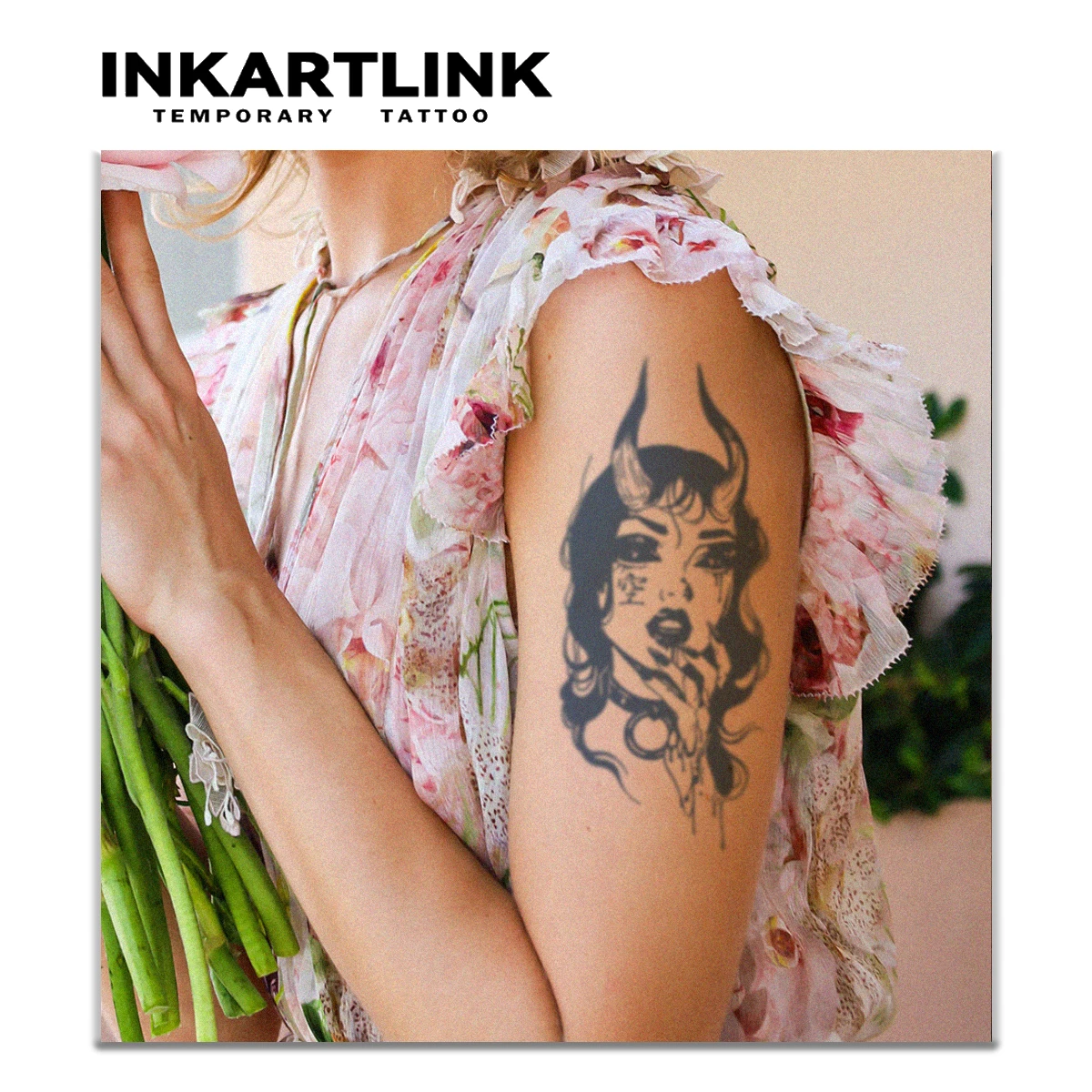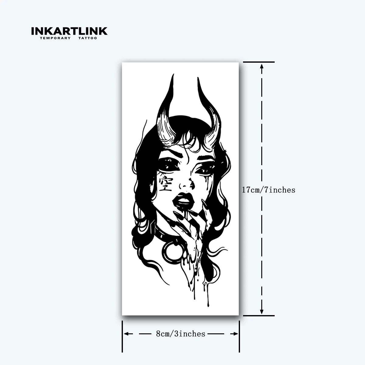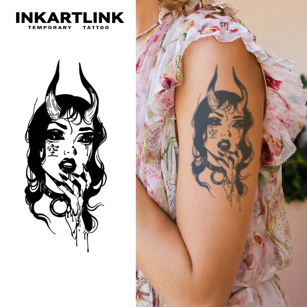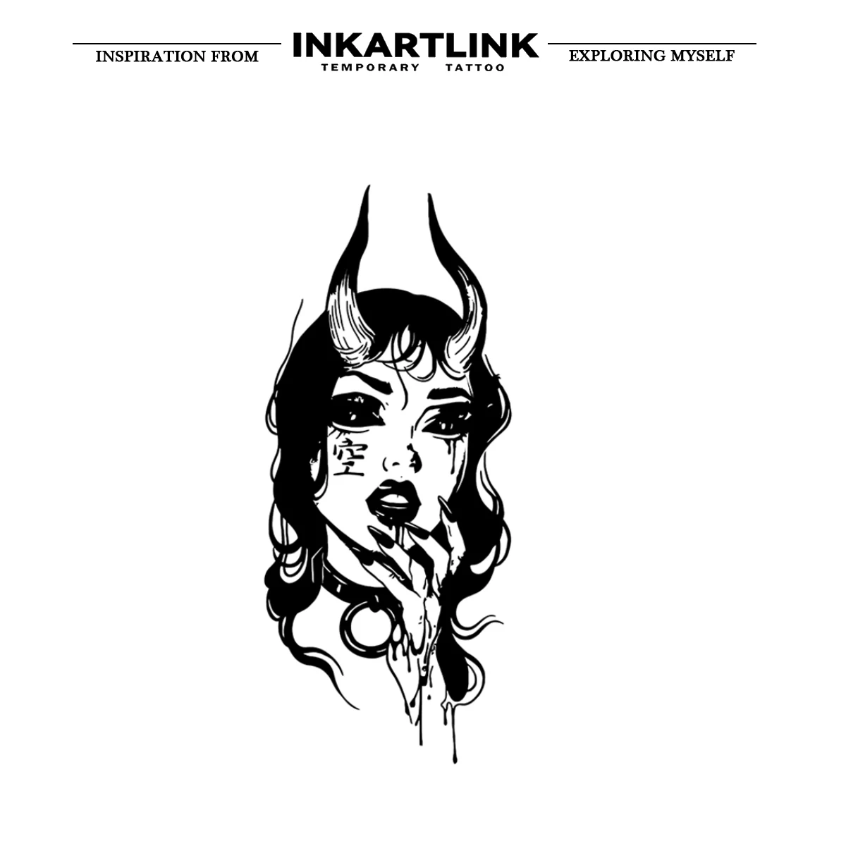 Ce tatouage temporaire représente une femme au look diabolique avec des cornes et des larmes coulant sur son visage. Ce design sombre et mystérieux est idéal pour ceux qui cherchent à exprimer un côté rebelle et énigmatique.