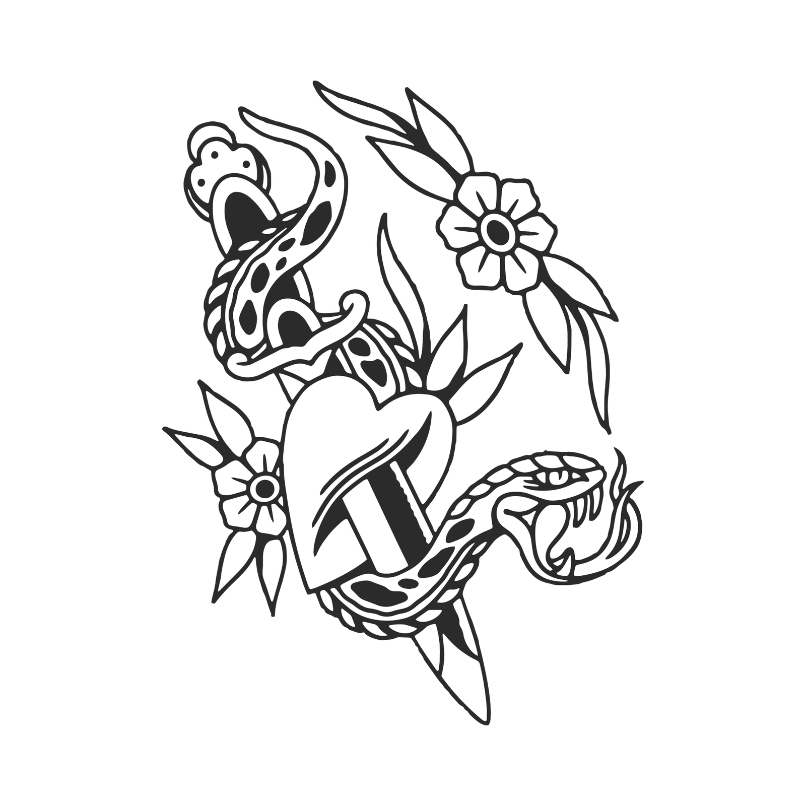 - Design: Vintage heart and sword motif with a serpent and floral accents.